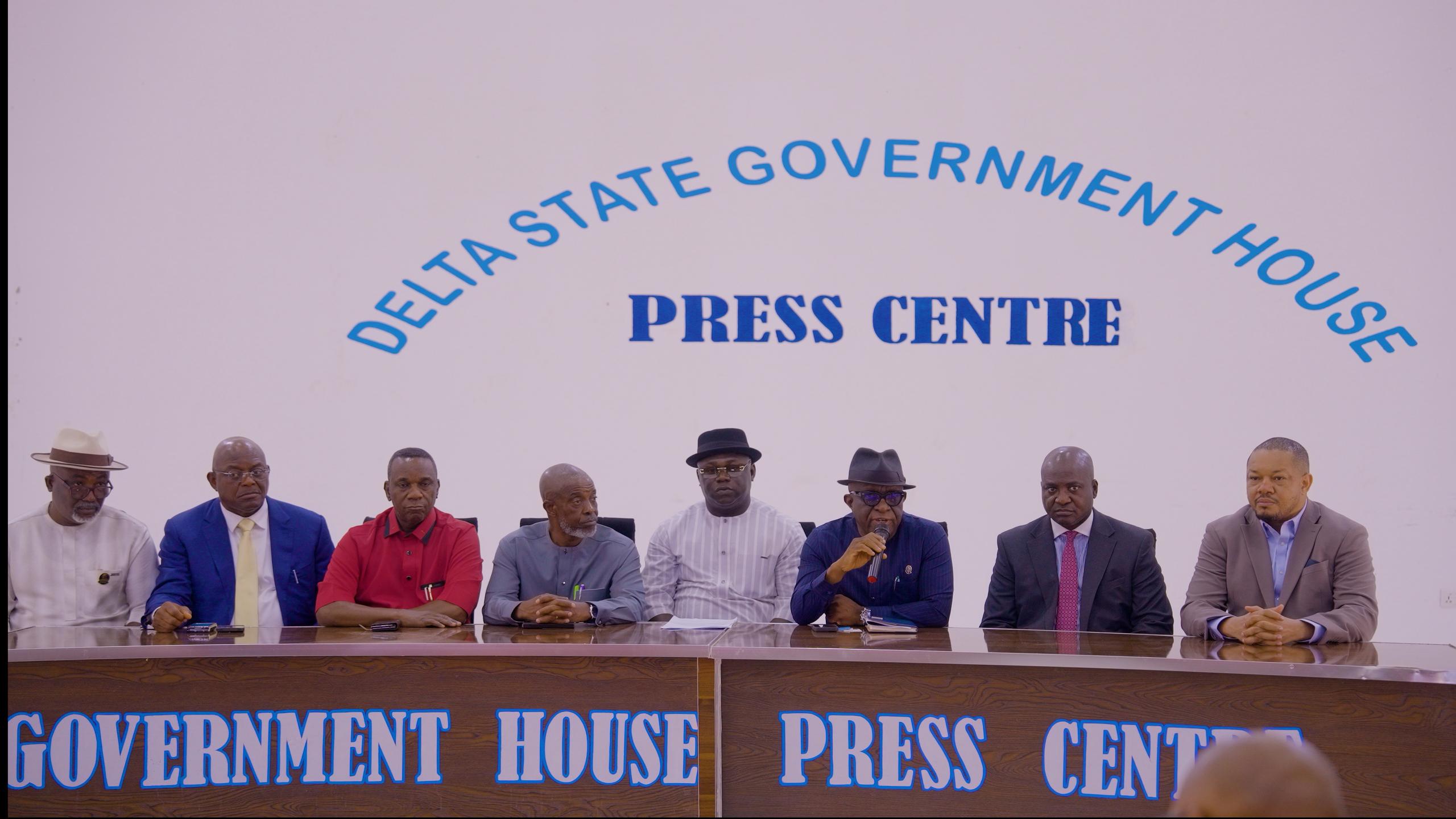 From left: Chief Press Secretary to the Delta State Governor, Sir Festus Ahon; Lead Partner, Details Commercial Solicitors, Mr. Ayoli Jemide; Commissioner for Finance, Sir Fidelis Tilije; Chief Executive Officer, Power Acumen Consulting Limited, Engr. Matthew Edevbie; Commissioner for Energy, Engr. Michael Anoka; Commissioner for Economic Planning, Mr. Sunny Ekedayen; Attorney-General and Commissioner for Justice, Mr. Ekemejero Ohwovoriole, SAN; and Managing Director, Infrastructure Bank Plc, Mr. Erhabor Okogun, during a press briefing following Governor Sheriff Oborevwori’s strategic meeting with energy experts and key government stakeholders at Government House, Asaba, on Wednesday.PHOTO: Bripin Enasurai