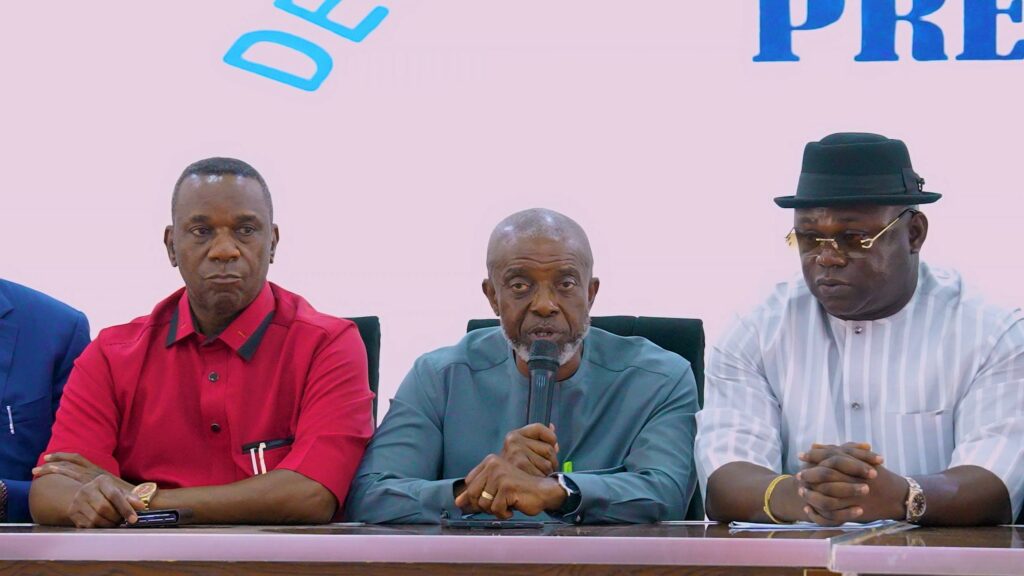 Chief Executive Officer (CEO), Power Acumen Consulting Limited, Engr. Matthew Edevbie (middle) fielding questions from journalists during a press briefing in Government House, Asaba on Wednesday, following Governor Sheriff Oborevwori’s strategic meeting with energy experts and key government stakeholders. He is flanked by the Commissioner for Finance, Sir Fidelis Tilije (left) and the Commissioner for Energy, Engr. Michael Anoka. PHOTO: BRIPIN ENASURAI