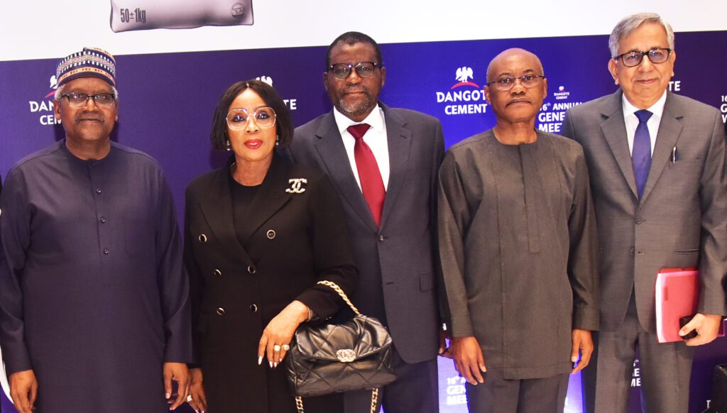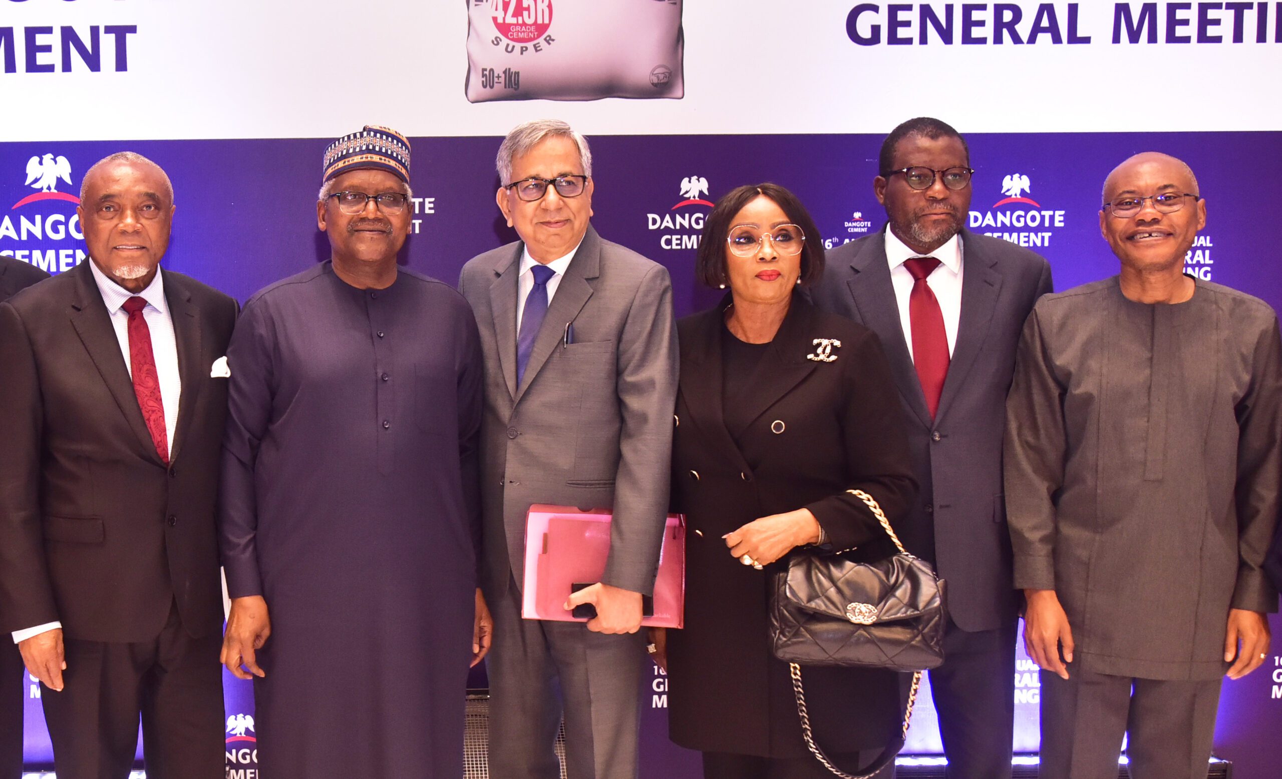 L-R: Independent Non-Executive Director, Dangote Cement Plc, Emmanuel Ikazoboh; Chairman, Dangote Cement Plc, Aliko Dangote; Group Managing Director/CEO, Dangote Cement Plc, Arvind Pathak; Independent Non-Executive Director, Dangote Cement Plc, Dorothy Udeme Ufot, SAN; Non-Executive Director, Dangote Cement Plc, Abdu Dantata; Non-Executive Director, Dangote Cement Plc, Olakunle Alake, at the 16th Annual General Meeting of Dangote Cement Plc in Lagos on Monday, June 23, 2025.