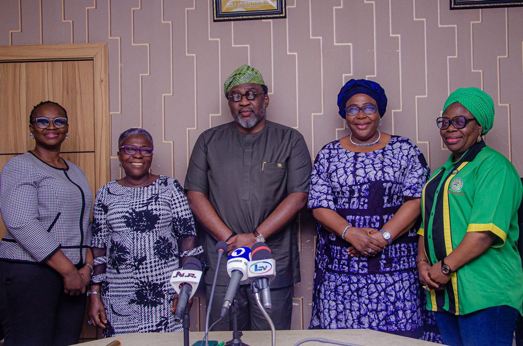 L-R: Director, Women Affairs, Lagos State Ministry of Women Affairs and Poverty Alleviation (WAPA), Mrs Olufunke Shyllon; Head, State Cash Transfer Unit, Ministry of Wealth Creation and Employment, Mrs Omolola Orimogunje; Commissioner for Economic Planning and Budget, Mr. Ope George; Permanent Secretary of the Ministry, Mrs. Olayinka Ojo and Director, Mrs. Oluwakemi Adedeji during a press conference on the Integration of National Identity Number (NIN) with the National Social Register (NSR), held at the Ministry’s conference room at the Secretariat, Alausa, Ikeja on Tuesday.
