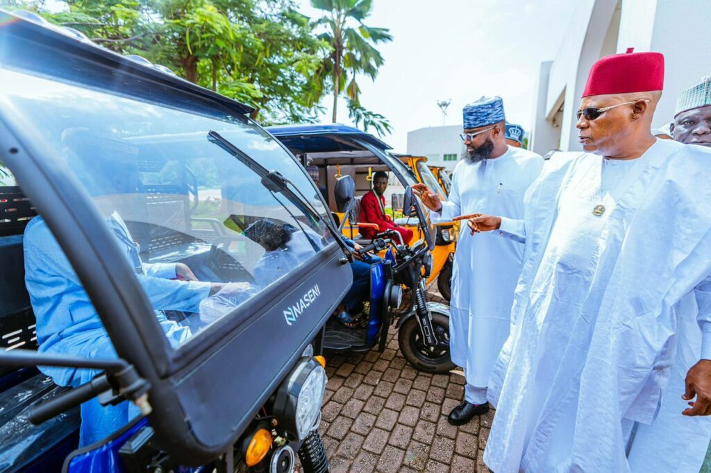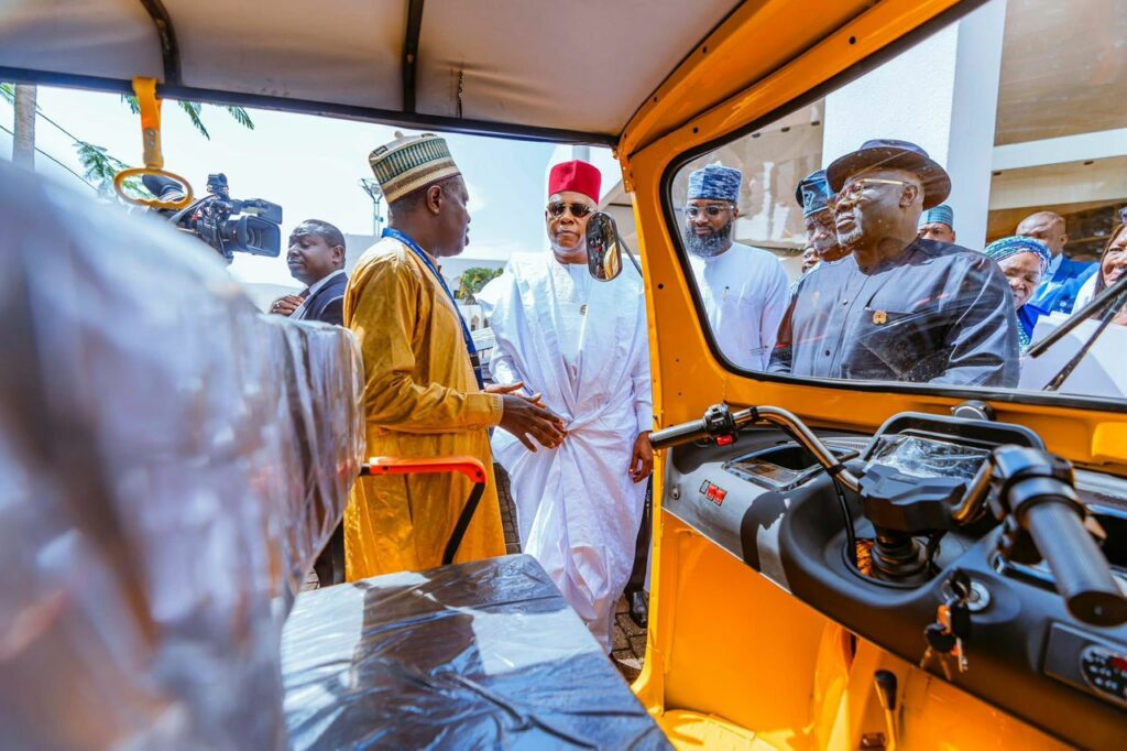 From Right: Vice President Kashim Shettima and Executive Vice Chairman,  National Agency for Science and Engineering Infrastructure (NASENI), Khalil Suleiman Halilu and Governor of Delta State,   Rt. Hon. Sheriff F. O. Oborevwor inspecting the Agency’s electric tricycles during the 152nd meeting of the National Economic Council (NEC) held at the Presidential Villa, Abuja on Thursday,  September 18, 2025.