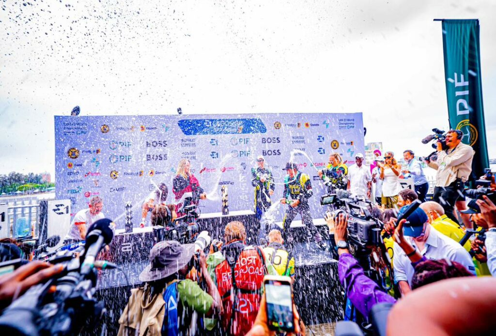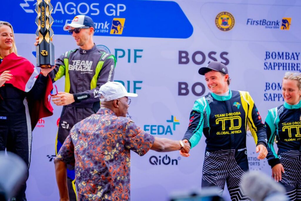 Governor of Lagos State, Mr. Babajide Sanwo-Olu presenting the trophy to winner of the E1 Lagos GP championship – Team Brazil during the grand finale in Victoria Island, Lagos, on Sunday, 5 October 2025.L-R: Governor of Lagos State, Mr. Babajide Sanwo-Olu congratulating pilots of Team Drogba Global Africa as the 1st runners up of the E1 Lagos GP championship, during the grand finale in Victoria Island, Lagos, on Sunday, 5 October 2025.Winners of the E1 Lagos GP championship celebrating during the grand finale in Victoria Island, on Sunday, 5 October 2025.