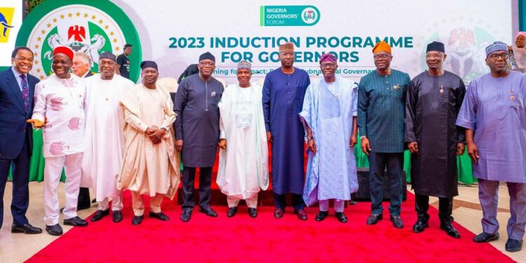 L-R: Hon Aminu Tambuwal, Governor of Sokoto State; Mr Donald Duke, former Governor of Cross Rivers State; Mr Terry McAuliffe, the 72nd Governor of Virginia; Mr Boss Mustapha, Secretary to the Government of the Federation; Engr Seyi Makinde; Governor of Oyo State; immediate past Governor of Ekiti State, Dr Kayode Fayemi and Mr Babajide Sanwo-Olu during the Nigeria Governors’ Forum (NGF) 2023 Induction programme for governors, at the Presidential Banquet Hall, State House, Abuja, on Tuesday, 16 May 2023R-L: Mr Babajide Sanwo-Olu, Governor of Lagos State making his presentation during the Nigeria Governors’ Forum (NGF) 2023 Induction programme for governors, with him:Engr Seyi Makinde, Governor of Oyo State; Mr Terry McAuliffe, the 72nd Governor of Virginia and Mr Donald Duke, former Governor of Cross Rivers State, at the Presidential Banquet Hall, State House, Abuja, on Tuesday, 16 May 2023L-R: Mr Donald Duke, former Governor of Cross Rivers State; Mr Terry McAuliffe, the 72nd Governor of Virginia; Engr Seyi Makinde and Mr Babajide Sanwo-Olu, Governor of Lagos State during the Nigeria Governors’ Forum (NGF) 2023 Induction programme for governors, at the Presidential Banquet Hall, State House, Abuja, on Tuesday, 16 May 2023L-R: Mr Babajide Sanwo-Olu, Governor of Lagos State, exchanging greetings with Mr Terry McAuliffe, the 72nd Governor of Virginia, during the Nigeria Governors’ Forum (NGF) 2023 Induction programme for governors, at the Presidential Banquet Hall, State House, Abuja, on Tuesday, 16 May 2023L-R: Mr Donald Duke, former Governor of Cross Rivers State; Prof Charles Soludo; Governor of Anambra State; his counterparts, Governor Abiodun Oyebanji (Ekiti); Governor Ahamdu Fintiri (Adamawa); immediate past Governor of Ekiti State, Dr Kayode Fayemi; Hon Aminu Tambuwal, Governor of Sokoto State; Mr Boss Mustapha, Secretary to the Government of the Federation; Mr Babajide Sanwo-Olu, Governor of Lagos State; his counterparts for Oyo, Nasarawa and Kwara States, Engr Seyi Makinde; Engr Abdullahi Sule and Alhaji AbdulRahman AbdulRazaq, during the Nigeria Governors’ Forum (NGF) 2023 Induction programme for governors, at the Presidential Banquet Hall, State House, Abuja, on Tuesday, 16 May 2023Mr Babajide Sanwo-Olu, Governor of Lagos State making his presentation during the Nigeria Governors’ Forum (NGF) 2023 Induction programme for governors, at the Presidential Banquet Hall, State House, Abuja, on Tuesday, 16 May 2023