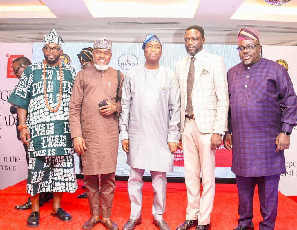Lagos State Governor represented by the Deputy Governor, Dr. Obafemi Hamzat (middle); Head of Service, Lagos, Mr. Bode Agoro (5th left); member, Lagos State House of Assembly, Hon. Oladele Ajayi (4th left); Deputy Chief of Staff to Governor Sanwo-Olu, Mr. Sam Egube (4th right); Chairman, Development Agenda for Western Nigeria (DAWN) Commission, Dr. Seye Oyeleye (2nd right); Chairman, Federal Civil Service Commission and Professor of Public Administration, Prof. Tunji Olaopa (right) and others during the event.