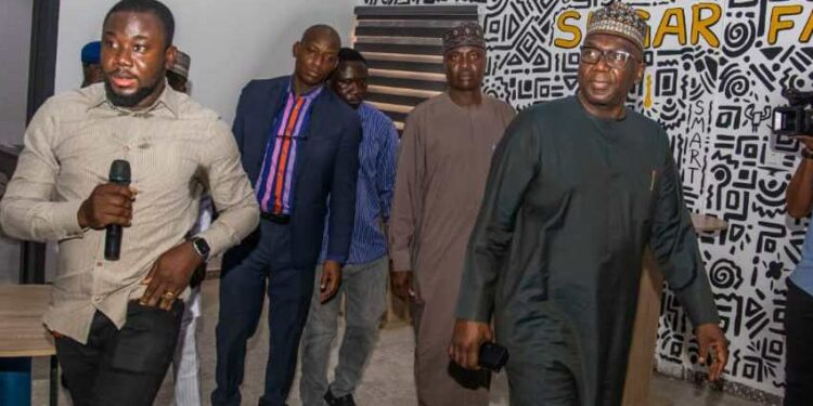 L-R: Project Manager Abolarinwa Kamaldeen; Alhaji Abdulrazaq Jiddah; and Kwara State Governor AbdulRahman AbdulRazaq (CON); during a visit to the new Sugar Film Factory in Ilorin, on Wednesday.